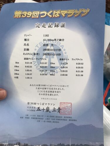 つくばマラソン 2時間59分27秒(ネット2時間59分16秒) 結果は嬉しいサブ3。ギリギリだけど。実態はペーサーに田中コーチに付いて貰っておんぶにだっこの3時間切り。29kmから右脹脛が痙攣し、ハムストが攣った時は一度は完全停止してストレッチしたが、何とか…